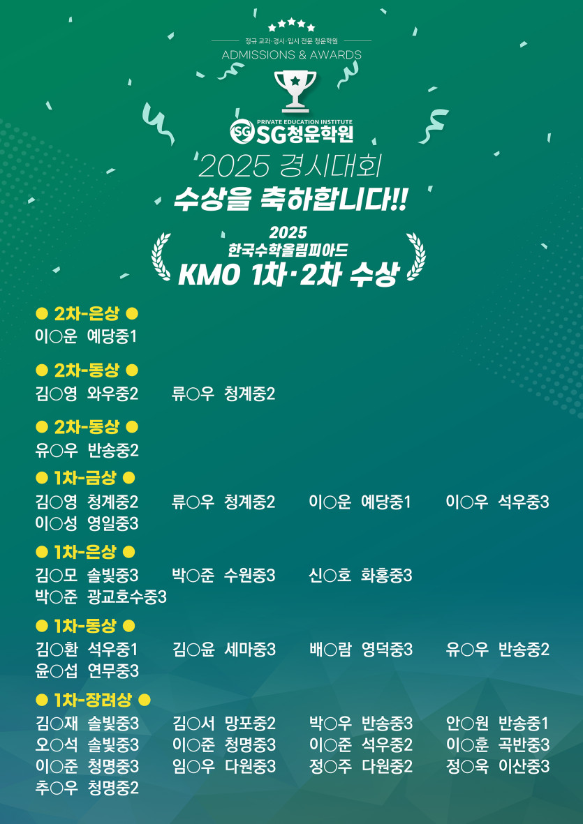 목록 2025 KMO 1차·2차 수상을 축합합니다. 페이지 정보 SG청운학원 2026-01-02 104 회 0 건 본문 이전글2025 2학기 기말 내신 만점을 축하합니다. 다음글2026학년 서울대학교 수시 합격을 축하합니다.