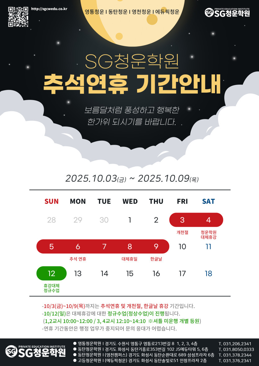 목록 추석 연휴 기간 휴강 안내 페이지 정보 SG청운학원 2025-09-24 76 회 0 건 본문 추석 연휴 기간 휴강 일정에 대해 안내 드립니다. 보름달처럼 풍성하고 행복한 한가위 되시기를 바랍니다. 감사합니다. 이전글2025 예비고1 입시간담회 “고교선택의 유불리” - 영통청운학원 다음글2026학년 영재학교 합격을 축하합니다.