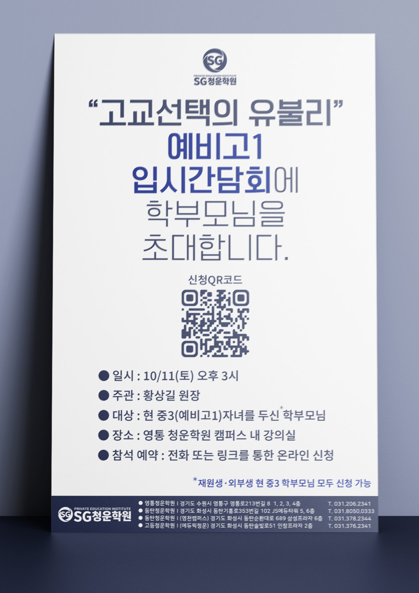 동탄청운학원 간담회에 이어 영통청운학원에서 계속해서 변화하는 입시에 대해 어떻게 고등학교를 준비해야 하나란 주제로 학부모님을 모시고 간담회를 진행하려 합니다.