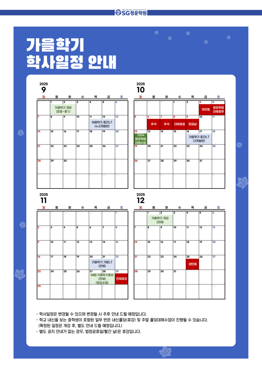 가을학기의 시작에 맞춰 청운학원에서는 25년 9월 가을학기를 위한 신규 입학테스트를 진행합니다.